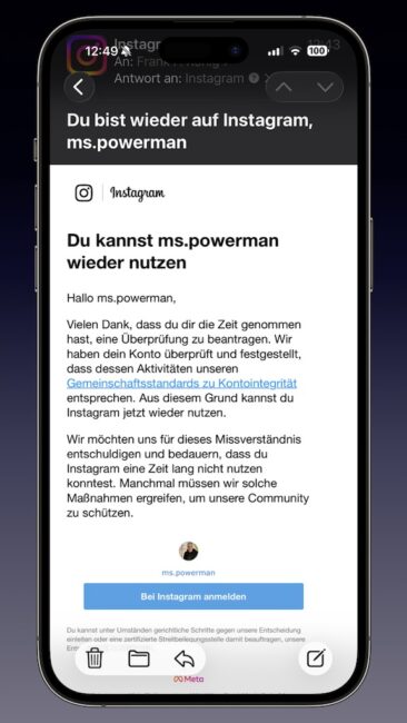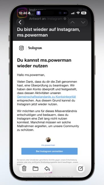 Schön, dass du da bist! Allerdings ist das Thema wirklich nicht für ernsthafte Diskussionen auf Instagram geeignet. Aufgrund der zahlreichen Anfragen und Meldungen bezüglich des Hacks meines Instagram-Kontos konnte ich es mit erheblichem Aufwand über den untenstehenden Link wiederherstellen und alle Zugangsdaten, auch außerhalb von Instagram, ändern. Nach der Rückholung konnte ich über 111 Nachrichten zählen, die voller Hinweise und Wünsche der Community steckten – einfach unglaublich!